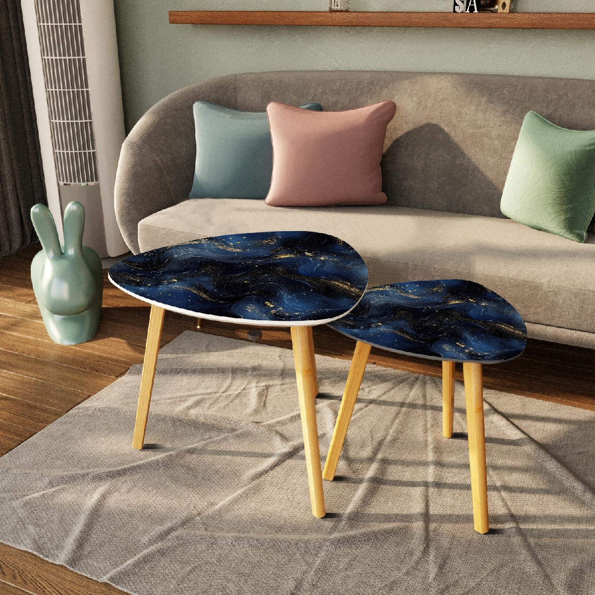 Small Coffee Nesting Table set Luxury Blue Marble Gold Abstract Texture Indigo Ocean Blue marbling Modern Minimalist Side Table Triangle End Tea Table Center Table Set of 2Living Room Bedroom